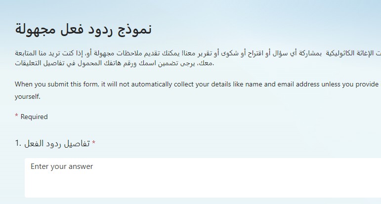 تواصل معنا بسهولة: يمكنك تقديم أي ملاحظة، اقتراح، شكوى، أو تقرير إلى خدمات الإغاثة الكاثوليكية، سواء بشكل مجهول أو مع بياناتك للمتابعة.